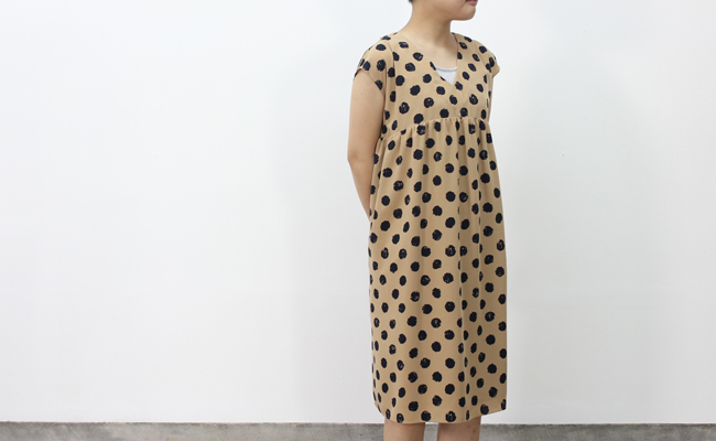 今季より取り扱いをスタートした『dahl’ia/ダリア』から光沢感のある滑らかな生地を使用したノースリーブワンピース。大胆な手書き風ドット柄がdahl’iaらしい存在感のある一枚です。
