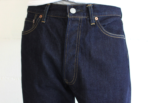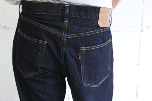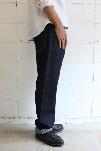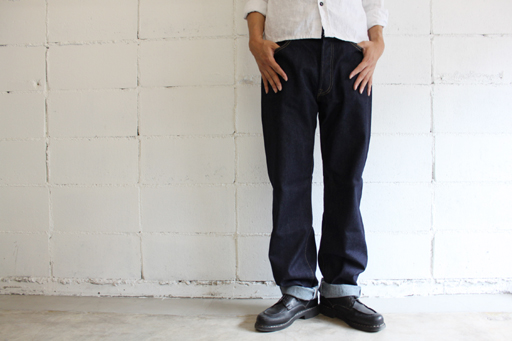オリジナルの12.5ozのデニム生地。今日によく見られるリジットワンウォッシュのデニムのような、分厚い生地はあえて使わず履きくたびれた状態になった時に、ヴィンテージデニムのようなあの薄くゆるい風合いに近い雰囲気に仕上がるようにアタリもでやすく、履き心地も軽いこの生地を作りました。