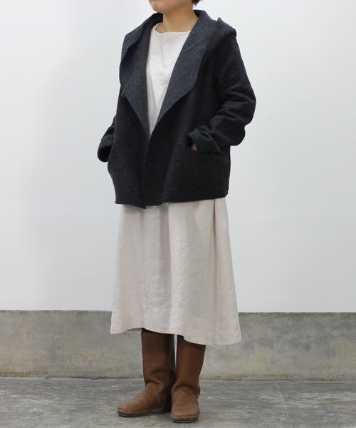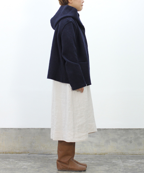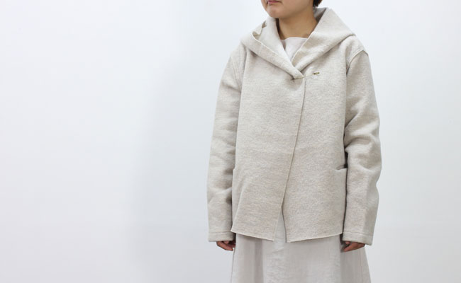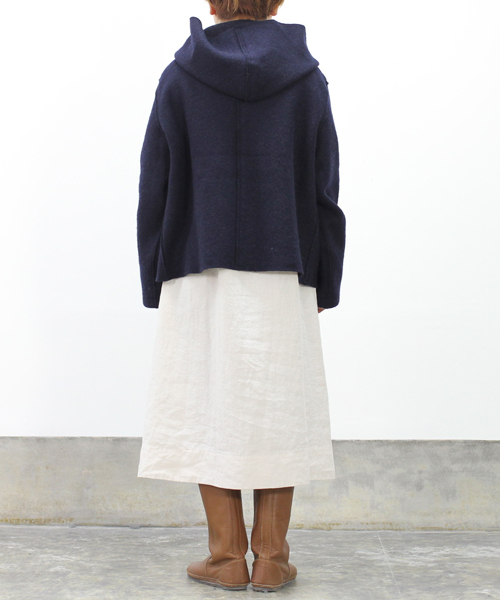 evamevaでは毎年定番、人気の圧縮ウールのニット生地を使用したシリーズ。印象的な大きめのフードと、切りっぱなしのような仕上げのシンプルなデザインで