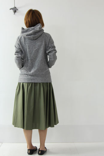 ウエスト部分にたっぷりのギャザーが入り、歩くたびにふんわりと揺れる ボリュームのあるAラインシルエットが特徴です。