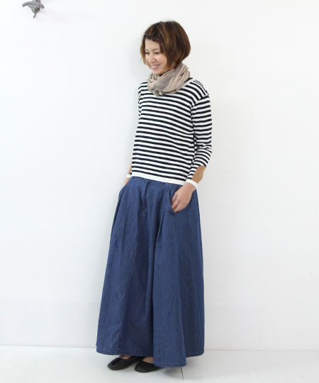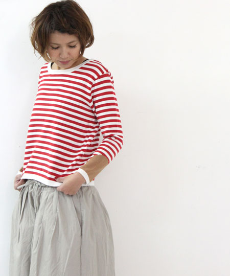 こちらもボーダー。可愛いニット地で。袖口のレザーパッチ風編地もいい感じ。