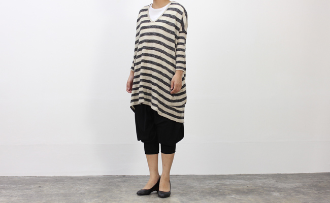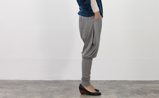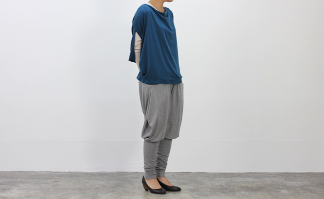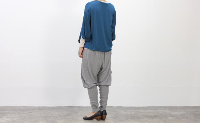 裾のリブがポイントになった変形シルエットのパンツ。とろっとした生地感が上品な雰囲気で、