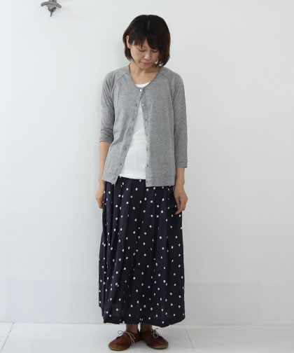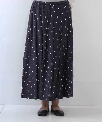 inaの定番。ざっくりしたリネンの風合いに可愛いドット柄がアクセントになったロングスカート。