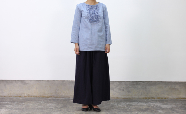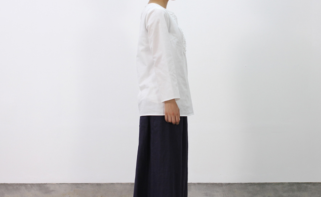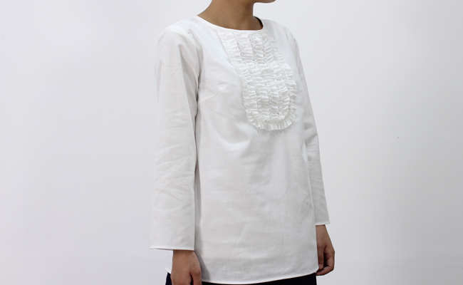 フロントにたっぷりとあしらわれたフリルが印象的なブラウス。コットンキャンバスのしっかりとしたハリのある生地を使用し、カチッとした上品な雰囲気に。