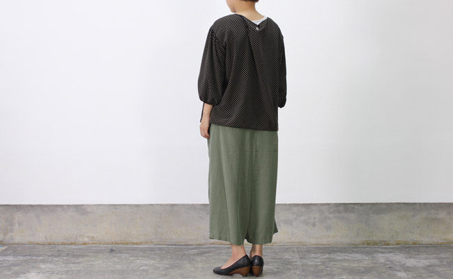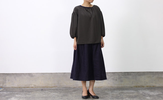 ドットプリントが施された生地を使ったドロップショルダーのプルオーバーブラウス。ポリエステル素材なのでふんわりとしたデザインでも落ち感が出てすっきりとしたシルエットに。