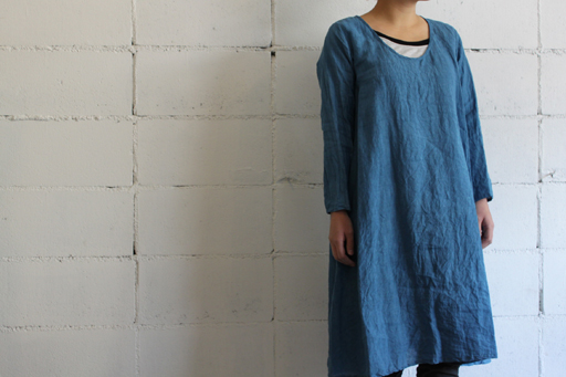 リネンインディゴAラインワンピース mizuiro-ind/ミズイロインド col:30 サックス 14,175円(税込) 生地はくったりと洗いをかけたリネン素材に インディゴ染めを施すことで