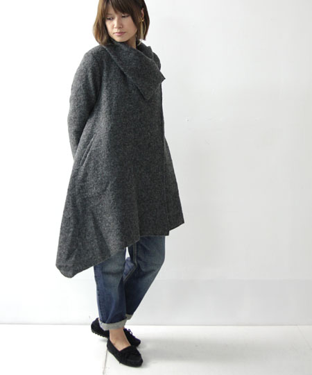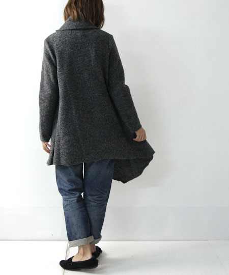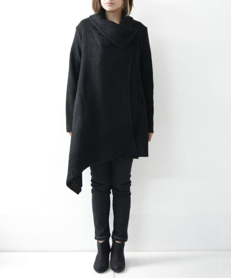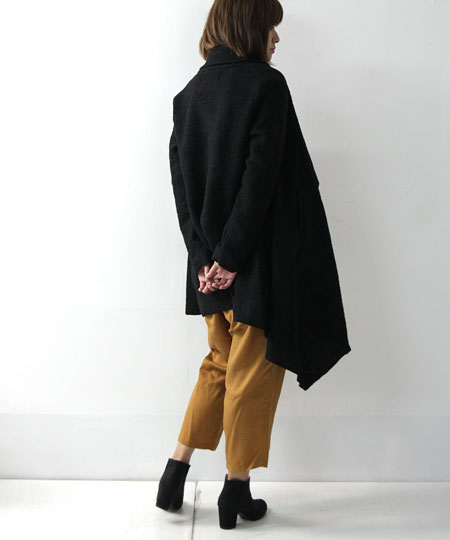 圧縮ウールの一重ドレープカーディガン。シンプルながら存在感のあるデザインで、モード感漂うシックな仕上がりです。