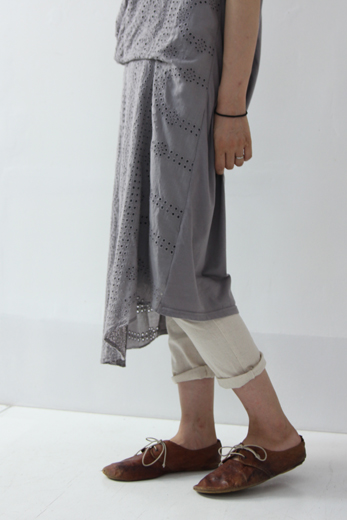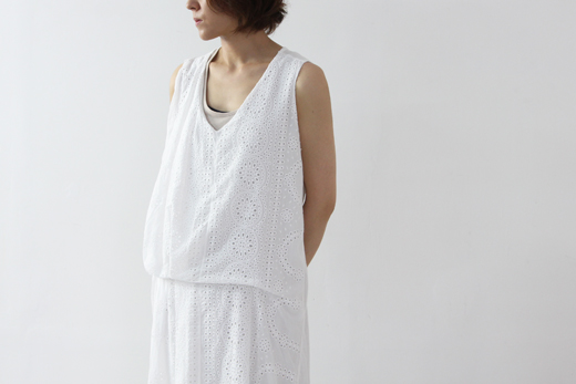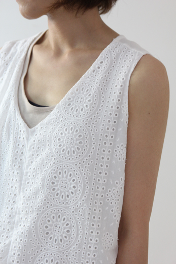 アイレットレースと カットソーの無地生地との コンビネーションの ノースリーブワンピース。