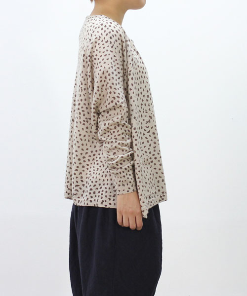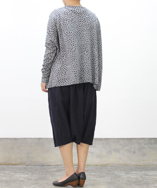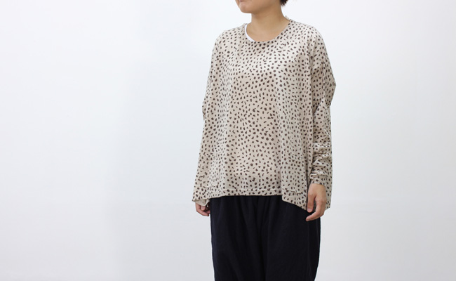 ポンチョのようなワイドなシルエットが可愛いプルオーバー。ウール混の薄手で柔らかな生地感は着心地が良く、優しい肌触り。アニマルプリントのような目を惹くドットデザインはコーディネートのアクセントとしても活躍。