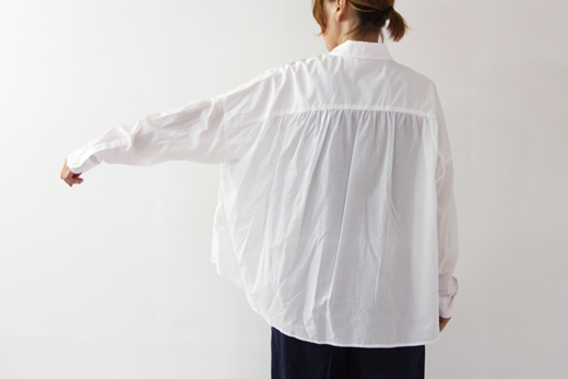 ドルマンスリーブ、バックのギャザーで女性らしい雰囲気をプラス。