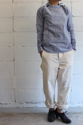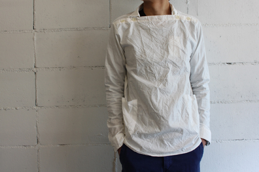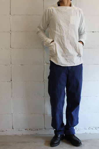 こにちわ。 今季のnisicaもやっぱりこれからスタート。 ボートネックに変形の襟 ボタンが付いたnisica定番のデッキマンシャツ。 薄手の柔らかいコットンオックス生地は着心地も抜群。 両サイドの大きなポケットや独特の形は 一枚でも充分存在感のあるデザインです