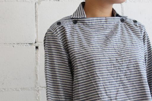 変形ボートネックの襟元に肩のボタン