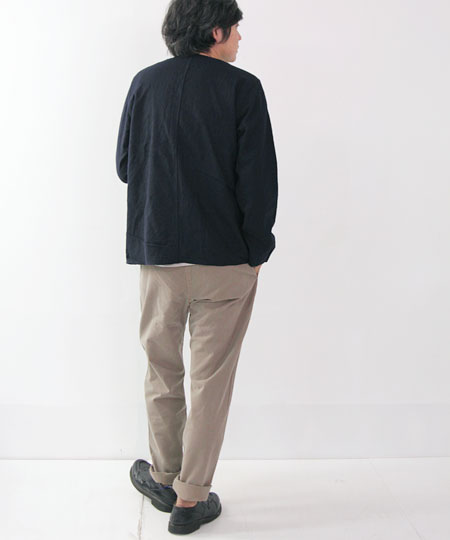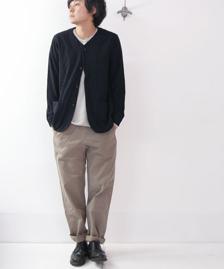 程よい厚み、洗いのかかったさりげないシワ感がナチュラルな素材感のウール生地を使用。