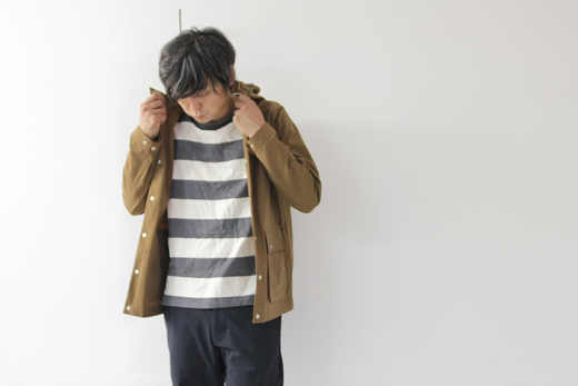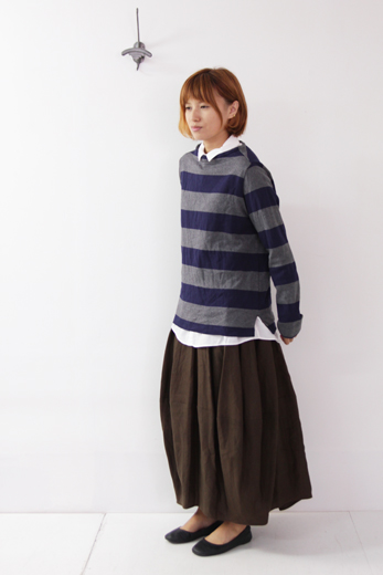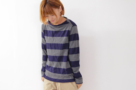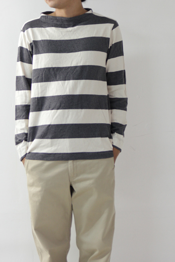 ガンジーネックのシンプルかつアクセントの効いたデザインにぴったりnisicaでも少し珍しい、太ボーダー柄バージョン。