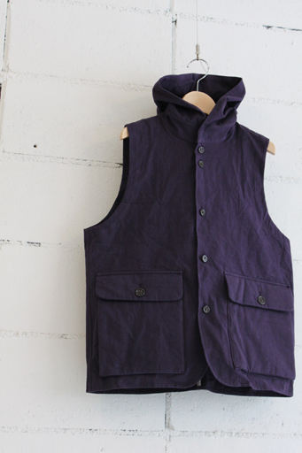 フードシャツ nisica/ニシカ col:ブルー こちらは 昨年の秋に登場した『フード付きシャツジャケット』を ベストに変形して春素材に。