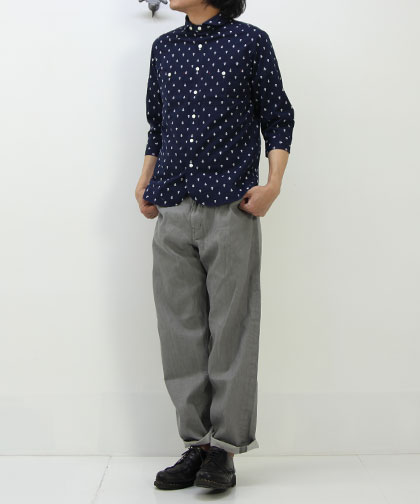 O gran naso!から薄手のコットン素材を使用した7分袖のシャツ。 生地にはイカリマークが全体に施され、 袖口の裏にはボーダーの別生地が貼られていて、マリンな雰囲気たっぷり