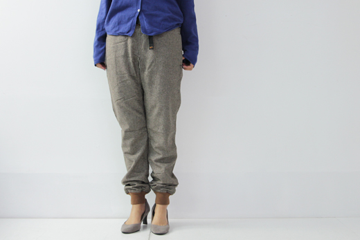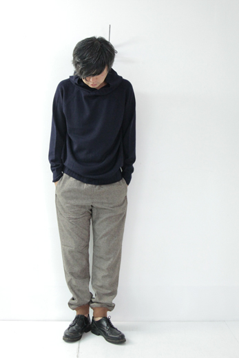 暖かみのあるウール混のサージ生地を使用し、リブにも同系色を配置した