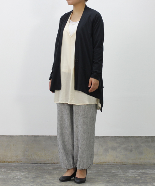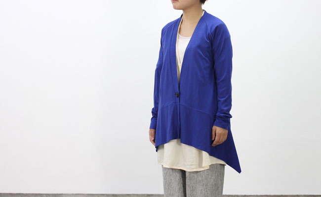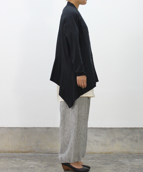 深めに開いたVネックラインがスッキリとした印象のカーディガン。両サイドが長くなったキレイなAラインが特徴的で、サイドから見た時にも表情のあるシルエットになっています。フロントの大きめボタンや、裾とサイドの切り替えがさりげないポイントに。