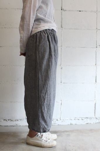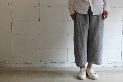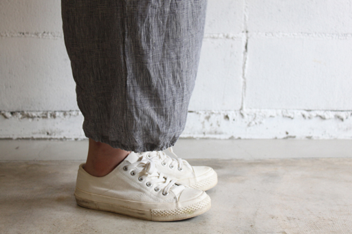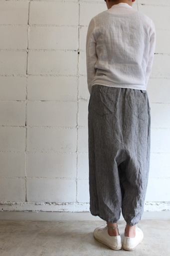 股上は深く、ワイドシルエットで8~9分丈の裾には 少しゴムが入った独特のデザインが特徴的。
