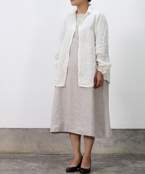 SURMERが得意とするくったりとした薄手のリネン素材を使用したブラウス。夏の終わりには軽い羽織代わりに、秋になれば羽織などの下にあわせたりと一枚でサラリと着る以外にも色々なスタイルで活躍してくれる一枚です。