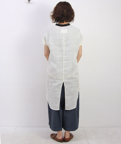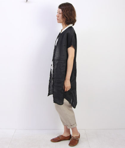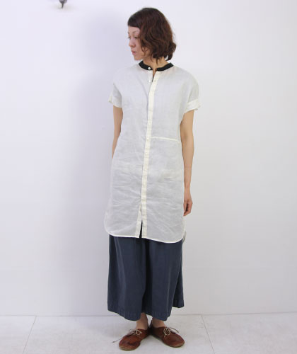 UNIVERSAL TISSU / ユニバーサルティシュ エンビシャツワンピース清涼感のあるラミー素材。ショートスリーブに燕尾になった後ろの裾、バイカラーのスタンドカラーがモードな雰囲気です。
