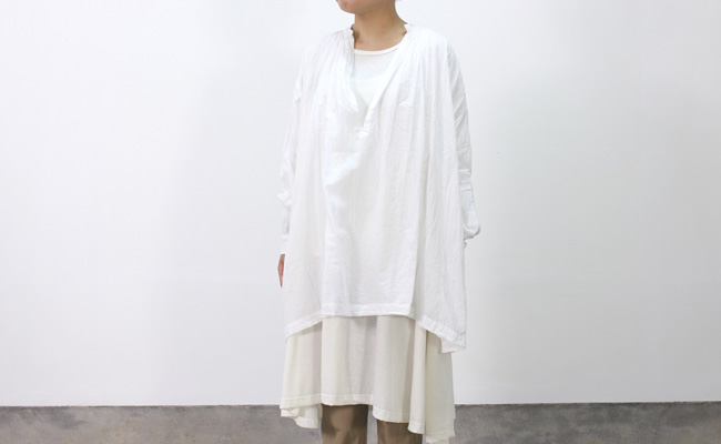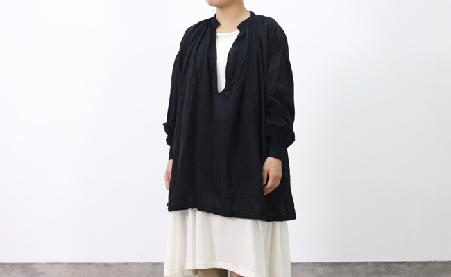 襟回りや袖に施された繊細なギャザーや肩のデザインなど細かなディティールに拘ったチュニック。