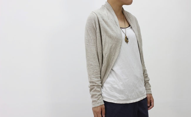 コルトレイクリネンの起毛天竺生地を使用したカーディガン。表側はやや起毛したような生地感で裏側はサラリとした生地感に。首周りに少しボリュームが出るデザインになっていてコーディネートのアクセントとしても活躍してくれる1枚。